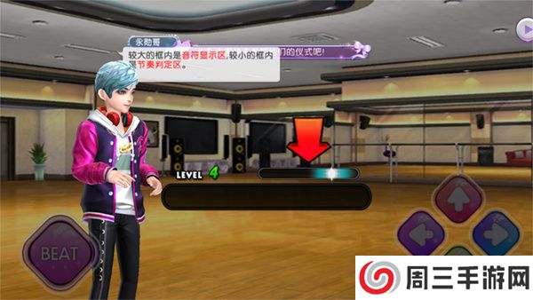 2. 之后,当进度条前进到节奏判定区时,玩家需要按下左边的“BEAT”按钮,输入的所有音符将会产生效果。当节奏点越接近歌曲的节拍时,也就是白色发光区域,就会获得较高的分数。