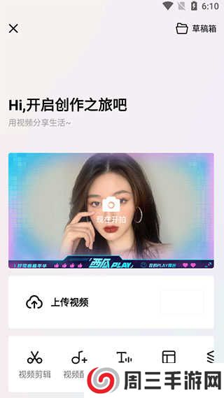4、发视频页面、你可自行创作、视频剪辑、视频配乐、识别字幕、创作模板等功能;