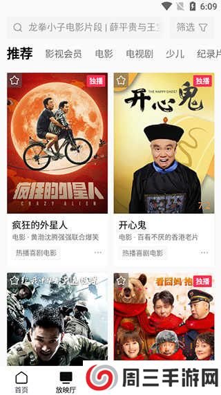 1、首先打开软件,进入到放映厅页面,这里可以免费观看电影、电视剧、少儿等等。