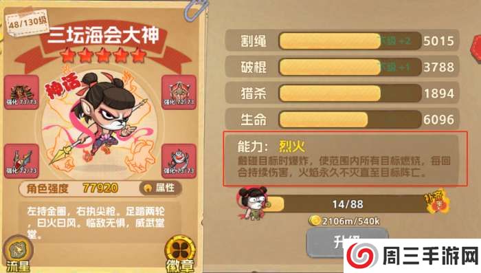 更令人叹为观止的是他的能力——烈火!一旦触碰目标,瞬间引爆,火焰如潮水般蔓延,将周遭一切吞噬。这火焰,不仅代表着毁灭,更是永恒的折磨,每回合持续伤害,直至目标在烈焰中倒下,化为灰烬。而这份火焰,永不熄灭,它是他胜利的宣言,是对敌人永恒的警示!