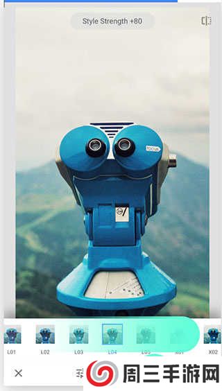 许多Snapseed过滤器还带有预先调整的样式,为编辑提供了良好的起点。例如,在GrainyFilm中,点击卡片图标以打开其选项列表。