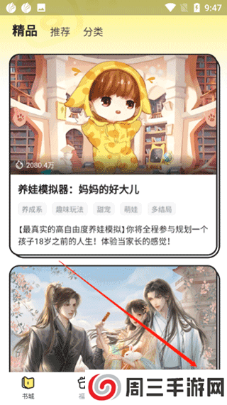 用户点击左下角书楼,即可进入书楼页面,页面有很多小说供你选择,可以选择精品、推荐、分类小说进行沉浸式阅读。