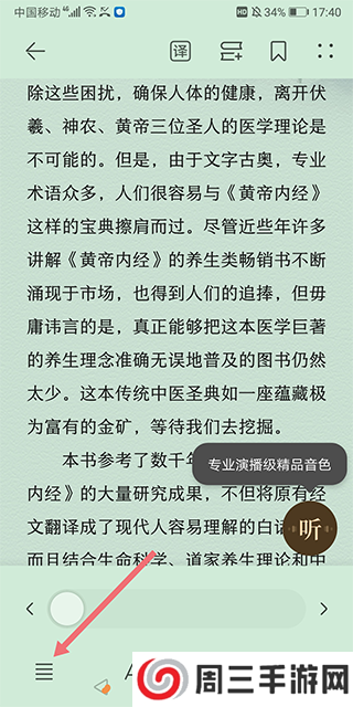 语音朗读安装方式华为阅读最新版本支持本地书语音朗读功能,建议更新到最新版本使用。支持语音朗读的书籍,在阅读正文中点击屏幕中间,呼起设置菜单,在右下角会显示“听"字图标,点击即可使用语音朗读功能。