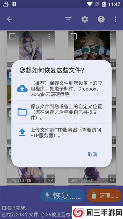 6、当点击恢复后,你可以选择保存文件到应用程序、自定义位置或是ftp服务器上。