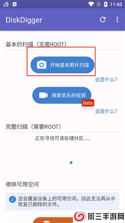 1、打开软件并进入,里面为用户提供了基本照片扫描和搜索丢失的视频,我们先点击基本照片扫描按键;