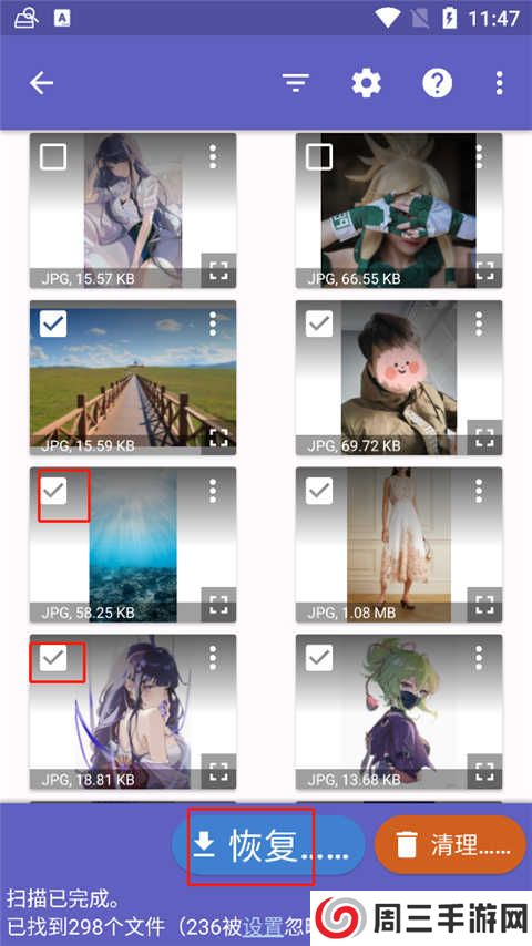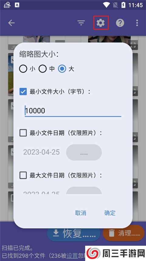 3、我们点击设置按钮,用户可以根据文件大小、日期等等进行照片的筛选,以便更好的恢复图片;