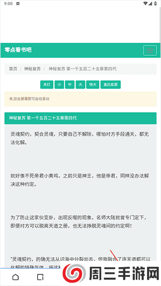 4、这个时候我们需要点击任意章节进去阅读,然后在箭头标记的地方选择阅读模式