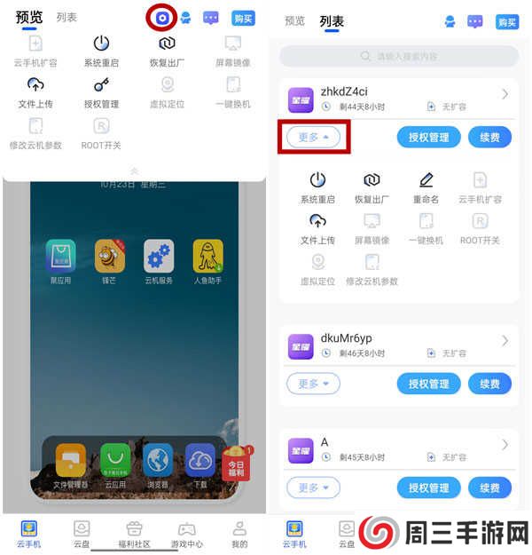2、进入双子星APP,点击上方【列表】按钮,进入云手机列表,选择故障的云手机点击【更多】,弹出设置栏,点击【重启】或【恢复出厂】按钮,云手机将进行重启或恢复出厂设置,请稍等30秒后再进入“云手机”。