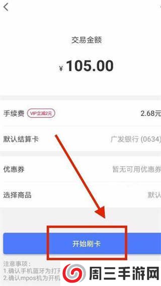 3、之后,点击“开始刷卡”后,就可以开始刷卡了。如果是根芯片卡直接插pos机右侧;如果是磁条卡则放在pos机顶端即可。
