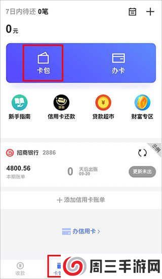 1、打开软件后,点击底部“卡管理”-“卡包”;