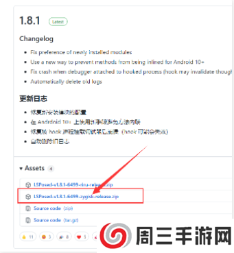5、在GitHUb 上的 LSPosed 仓库中,下载箭头所指的 LSPosed-Zygisk 版的模块;随后在Magisk框架中选择【本地安装】,安装下载到的 LSPosed 模块。