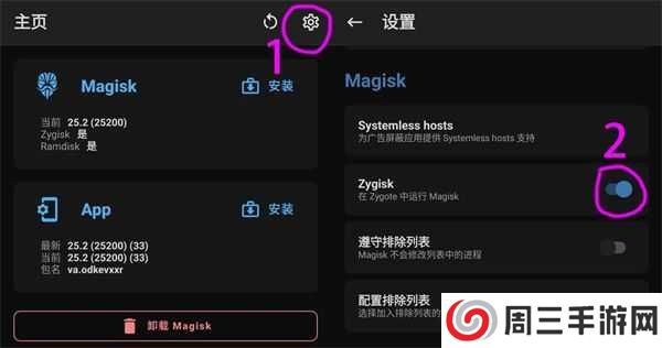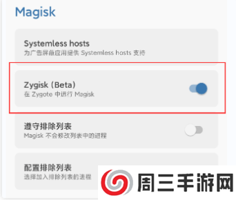 1、打开Magisk –设置 –开启 Zygisk;