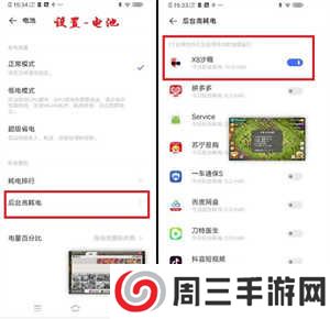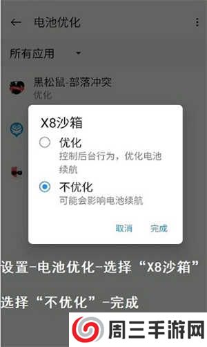 1.进入电池的省电设置选项,将X8沙箱的省电策略改为无限制。(类似的操作)