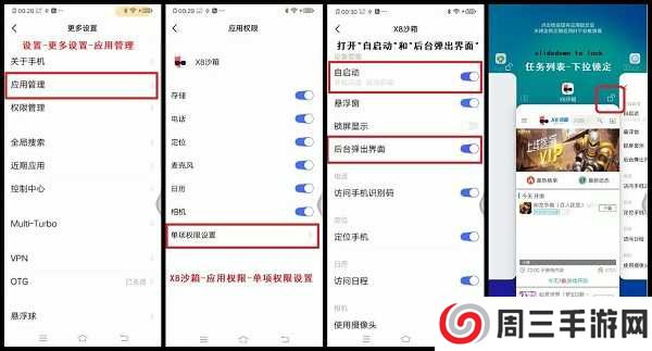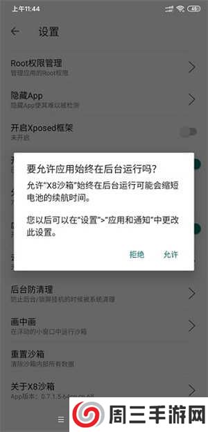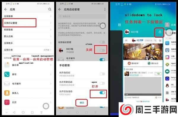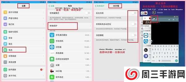 1.设置——电池——电池优化,选择“X8沙箱”——不优化;在任务栏中,锁定”X8沙箱”的应用;