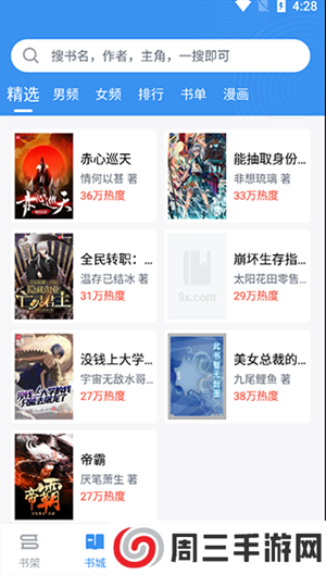 1.进入到9X阅读器app最新版后,点击“书城”里面我们可以看到有小说、漫画等。