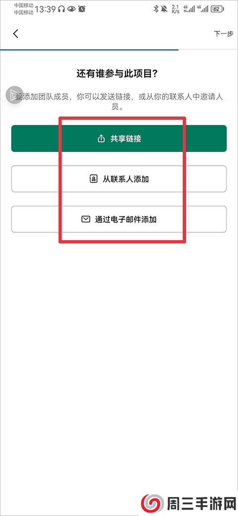 4、创建完成后就可以将链接发送给团队成员,也可以从联系人或者通过电子邮件添加