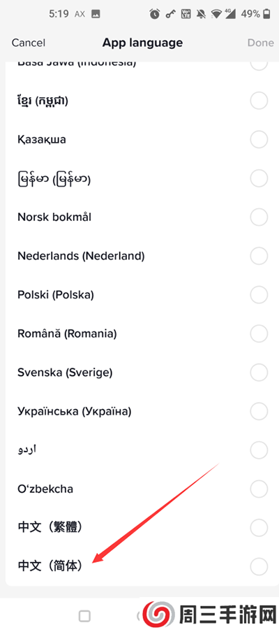 Profile (我的)-右上角”三”(设置)-App Language (应用语言)-中文(简体)-Done(完成)