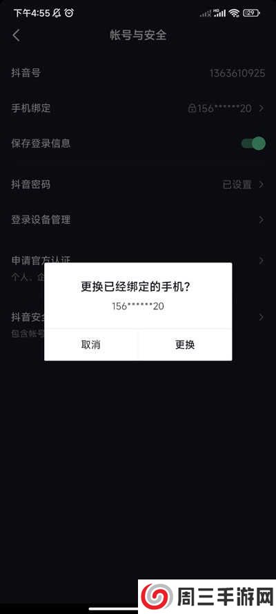 5、在弹出的更换绑定手机窗口中,点击更换,就可以换绑手机号了