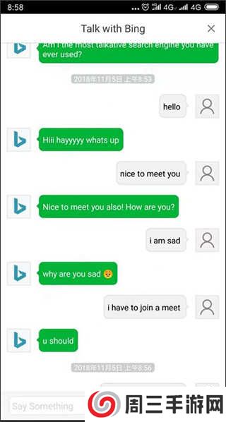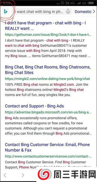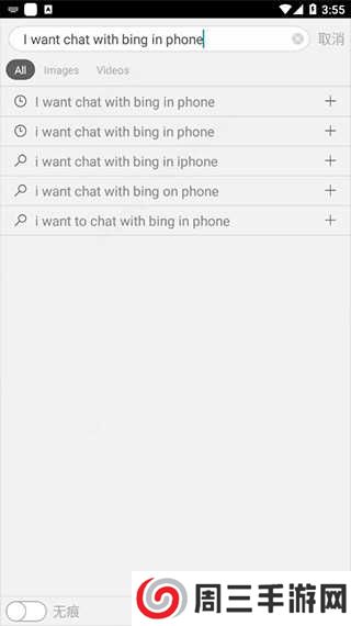 2、在输入框中输入“ I want chat with bing in phone", 手机上输入其他的文字不会调出 AI对话机器人,只有简单的搜索功能。