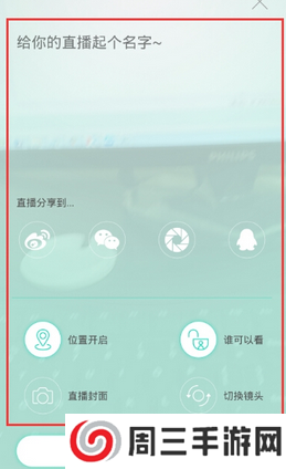 2、进入直播前的设置,在这里用户需要给你的直播起个名字,选择分享到的社交网络,同时还可以设置位置开启、谁可以看、直播封面、切换镜头等等参数。