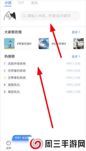 1.有想要下载的书籍,那么大家可以先通过输入“书名”、“作者”、“关键词”的方式进行搜索,也可以通过推送榜单查找小说;