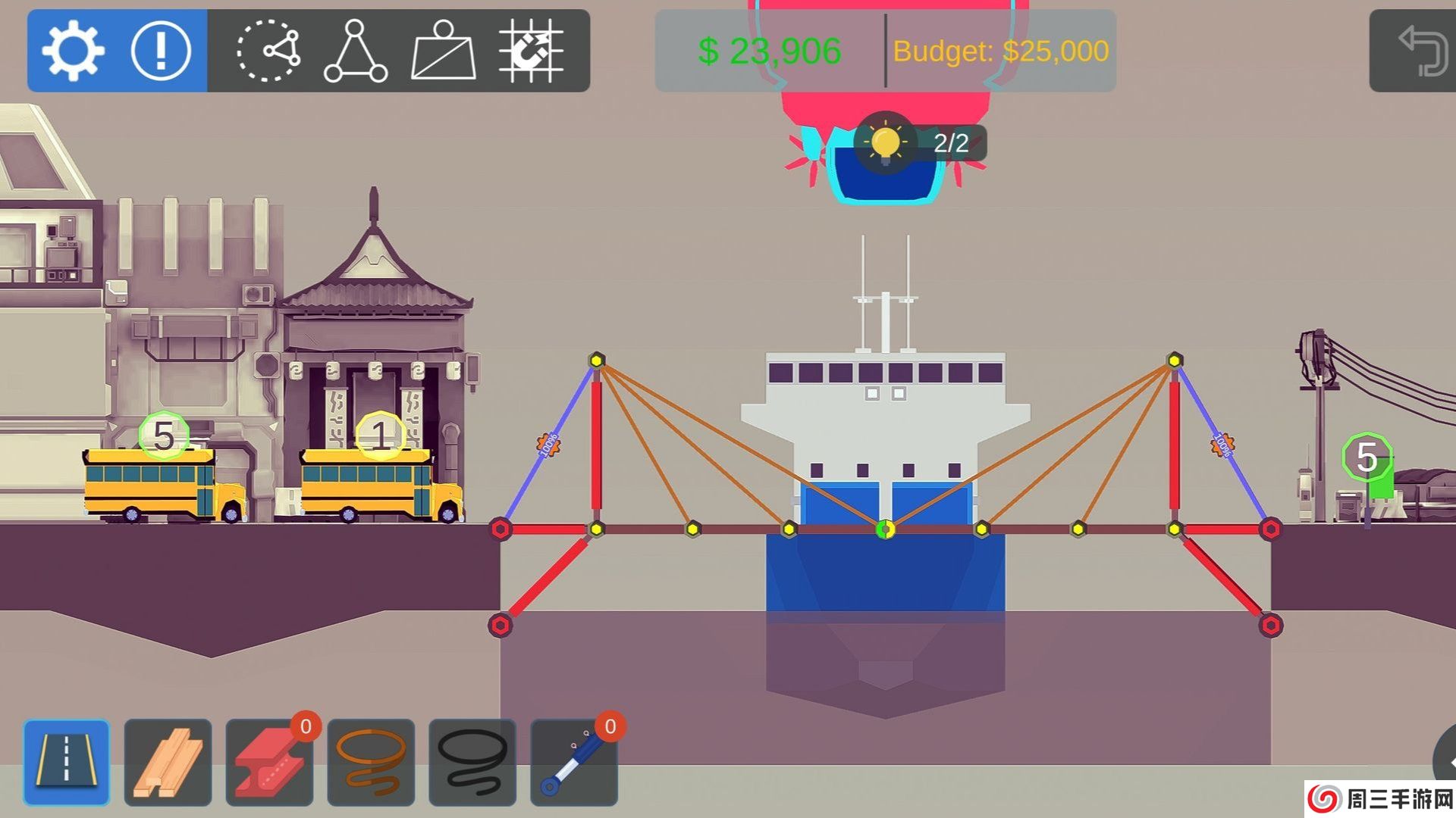 4. 测试桥梁:建造完成后,游戏会进行负荷测试,模拟车辆或行人在桥梁上的行走情况。如果桥梁能够承受负荷并保持稳定,则关卡通过;否则,玩家需要重新设计并建造。