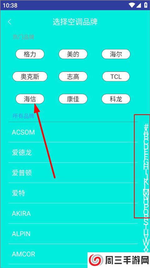 2、进入家电品牌页面,可以看到有格力、美的、海尔、志高等家电品牌,选择需要配对的家电品牌(也可按照家电拼音字母选择);
