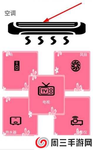 1、打开红钉app,进入主页,有空调、音响、风扇、电视等设配,点击需要配对的家电设备;