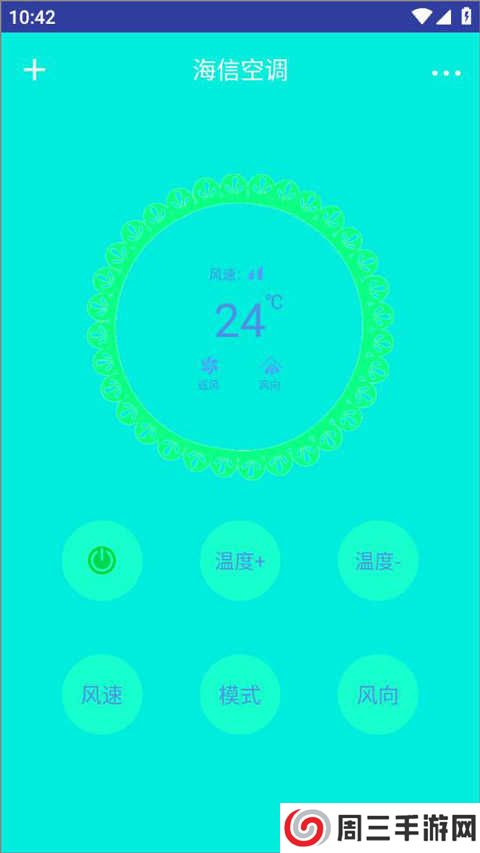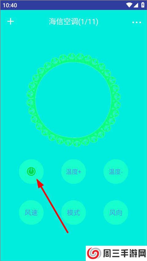 3、进入空调按键页面,可以看到有温度、风速、模式、风向等功能键,点击电源键打开;