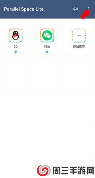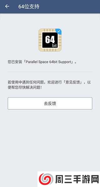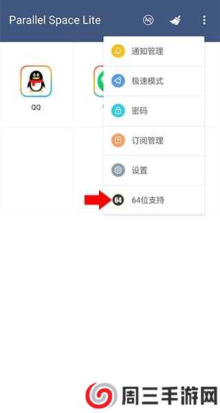 1、在本站下载并打开平行空间精简版,首先如果我们想要安装使用64位应用需要额外安装64位应用支持程序,先打开平行空间精简版应用,来到主界面后点击有右上角的三个点图标