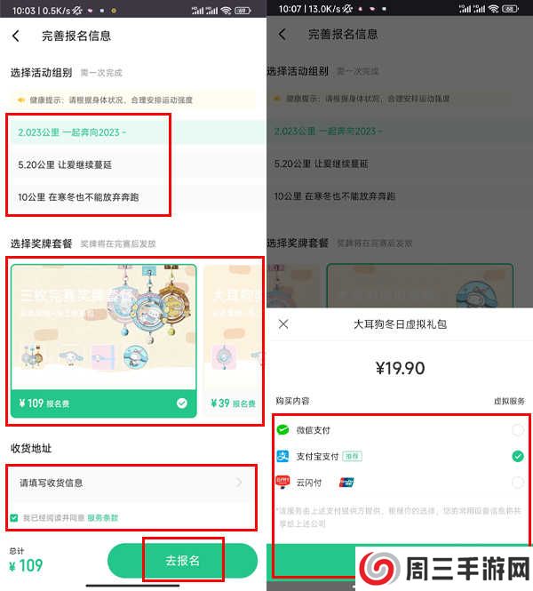 3、选择运动强度和奖牌套餐,填写信息后勾选协议,点去报名,确认支付即可。