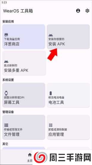 1、因为app它是属于手表上的app,所以如果想要安装它需要借助第三方工具来进行安装。在手机上下载wearos工具箱,并连接至我们的智能手表,然后点击下方的功能选项。