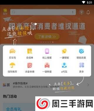 3、虽然在软件的首页分布了许多功能,但点击【更多】之后还有隐藏功能,下图中排版的功能是车主常用的,但极个别功能还需要通过点击更多来查看,而且针对部分用户的提问,该如何续保,那么借由下面这张图,点击“买车险”就能参与投保服务,若已经购买可免去此操作,若车险到期,还能就此续保哦!