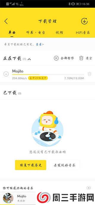 4、返回首页,点击我的-下载,即可看到歌曲正在下载;