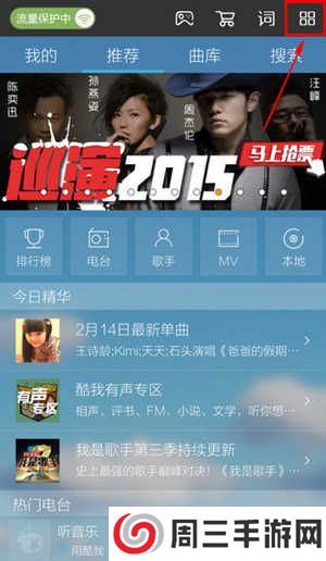 1、打开酷我在线听音乐播放器,在首页点击右上角的【菜单】;