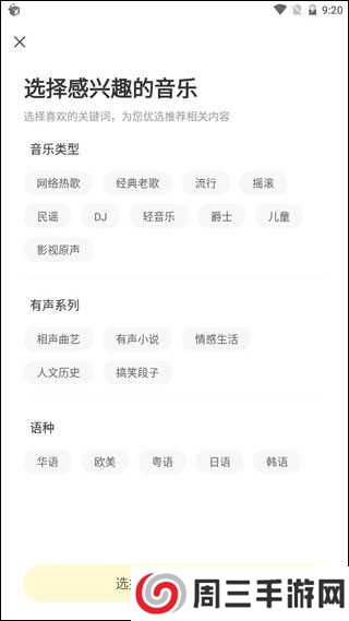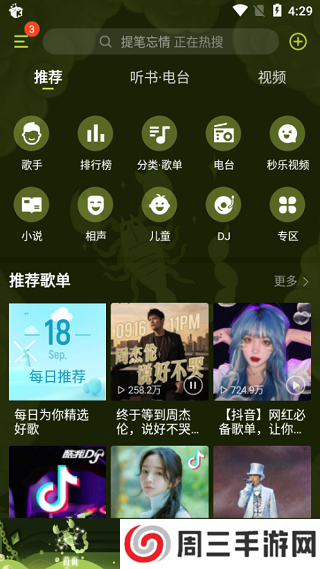 在曲库推荐上作出了最全面的细分类别,通过“热门”、“心情”、“主题”、“语言”、“特色”、“场景”、“曲风流派”七个维度来完成音乐的细致分类。