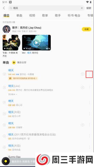 2、点击要下载歌曲最右侧的竖三点,如下图所示