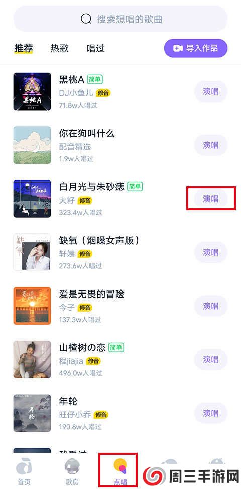 1、首先需要录制一段作品,在“点唱”页面找到一手想要唱的歌曲,点击“演唱”。
