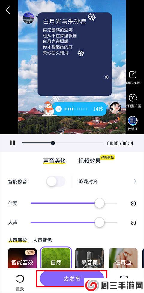 3、进入歌曲编辑阶段,可以调整声效,不满意还可以重录,编辑好点击“去发布”。