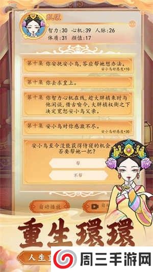 《后宫人生模拟器》是一款深度模拟古代宫廷生活的角色扮演游戏。玩家将扮演一位初入后宫的秀女,通过智慧、策略和运气,逐步晋升,体验从平凡宫女到母仪天下的传奇人生。游戏融合了历史、文化、情感与策略元素,为玩家呈现了一个丰富多彩、扣人心弦的后宫世界。