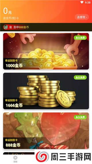 这里第一次注册的用户建议刮刮卡这个,进去一般三次就就凑够了,大家还可以看广告领金币,这个看十次就有一元。