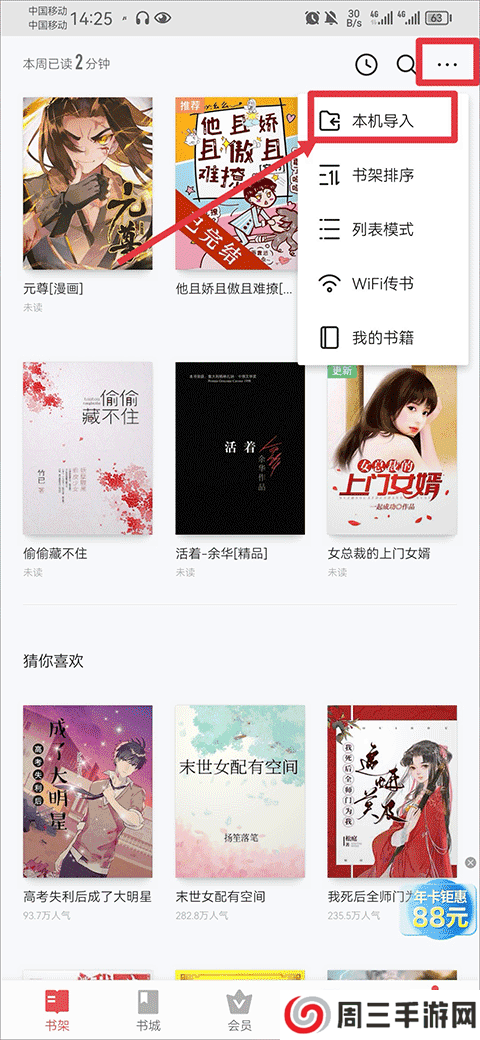 1、打开app,在书架界面中点击右上角三点,然后点击本机导入