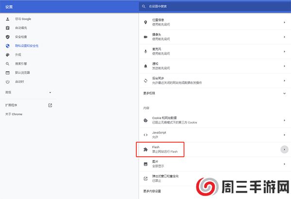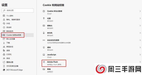 4、单击Cookie和网站权限,然后点击右侧的Adobe Flash