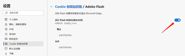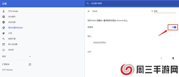 5、将使用Adobe Flash Player切换到“开”