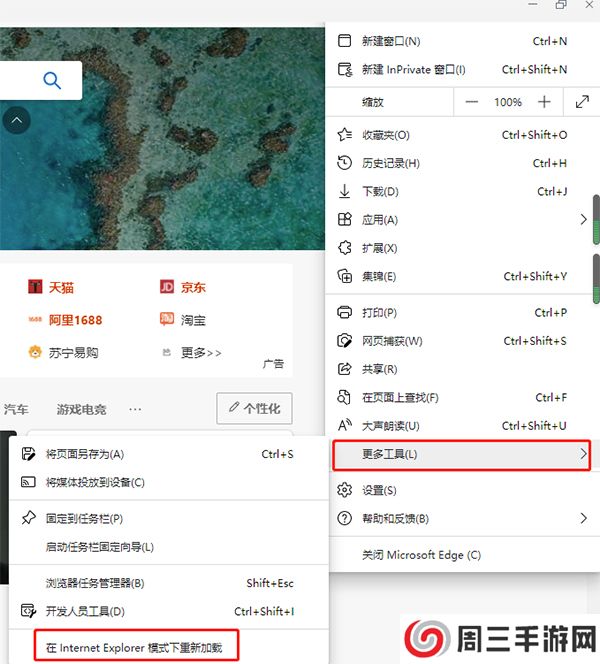 7、单击右上角的“…”图标,点击“更多工具”,然后再点击“在Internet explorer模式下重新加载”