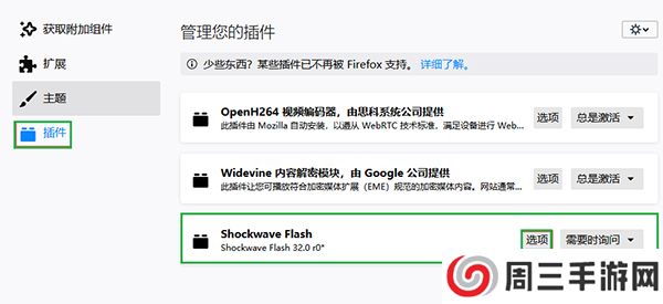 7、之后点击“插件”,选择Shockwave Flash点击“选项”按钮