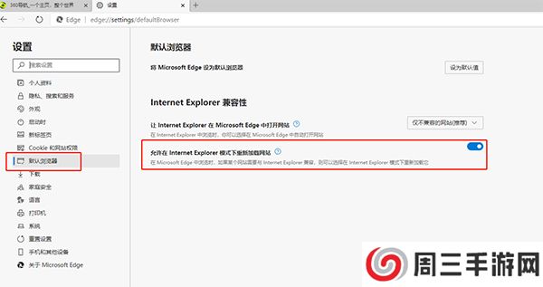 6、点击“默认浏览器”将“允许在 Internet Explorer 模式下重新加载网站”切换到“开”