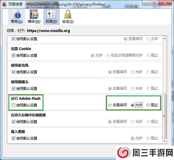 5、首先不勾选“使用默认设置”,然后再勾选“运行Flash”下的“允许”选项。