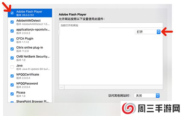 3、勾选上“Adobe Flash Player”,然后选中,确保右侧设置里的网址选项为“打开”状态,点击“完成”保存设置