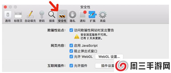 2、点击“安全性”标签,然后打开“插件设置”